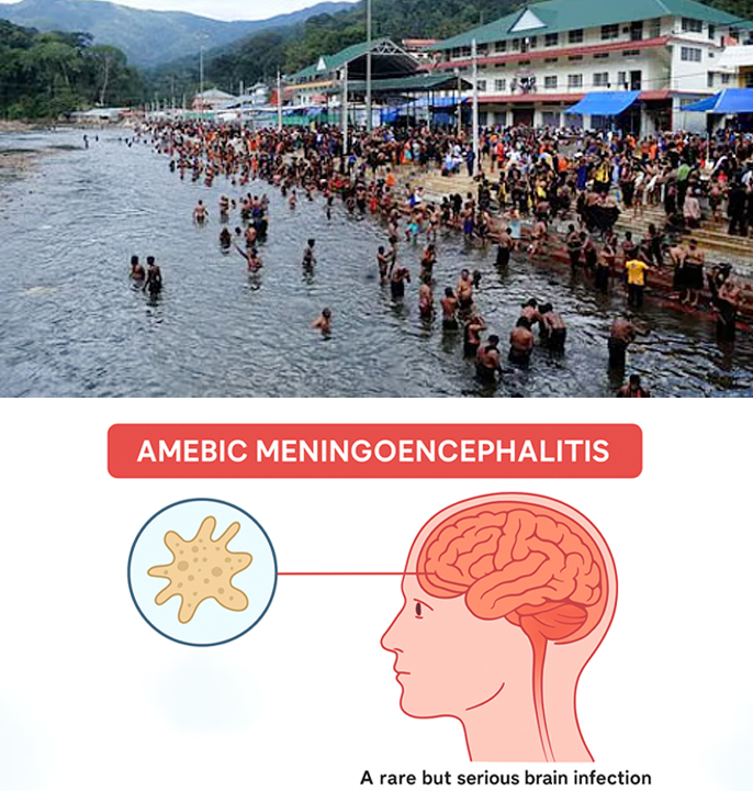 శభరిమాల అయ్యప్ప స్వామిని దర్శించుకునేందుకు వెళ్తున్న భక్తులకు, స్వాములకు కేరళ హెల్త్ డిపార్ట్మెంట్ కీలక హెచ్చరికలు చేసింది. స్నానాలు చేసే సమయంలో ముక్కులోకి నీరు పోకుండా చూసుకోవాలి అని తెలిపారు. సాధ్యమైనంతవరకు సురక్షితంగా శుభ్రపరిచిన నీళ్ళు ఉన్న చోటనే స్నానం చేయాలన్నారు. అతి లోతైన నీటిలోకి వెళ్లకూడదు. ఎక్కువగా చెరువులు, నదులల్లో స్నానాలు చేసినప్పుడు వచ్చే ఆవకాశం వుంటుందని తెలిపారు. ఈ వ్యాధి తీవ్రంగా ప్రాణాంతకం, నీరు ముక్కులోకి వెళ్లినప్పుడు అమీబా నేరుగా మెదడును చేరుతుంది. ఇది ఒకరినుండి ఇంకో వ్యక్తికి వచ్చే వ్యాధి కాదు.